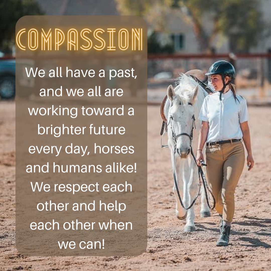 We all have a past, and we all are working toward a brighter future every day, horses and humans alike! We respect each other and help each other when we can! If you see someone putting a saddle pad on backwards, offer to help. If you see someone struggling to hold a hoof up, team work!! That's where you'll find the biggest breakthrough in your horsemanship. When you can see another in distress and show concern for them, you will find they will do the same for you, especially when it comes to horse lovers. Strive to show compassion whenever you can.