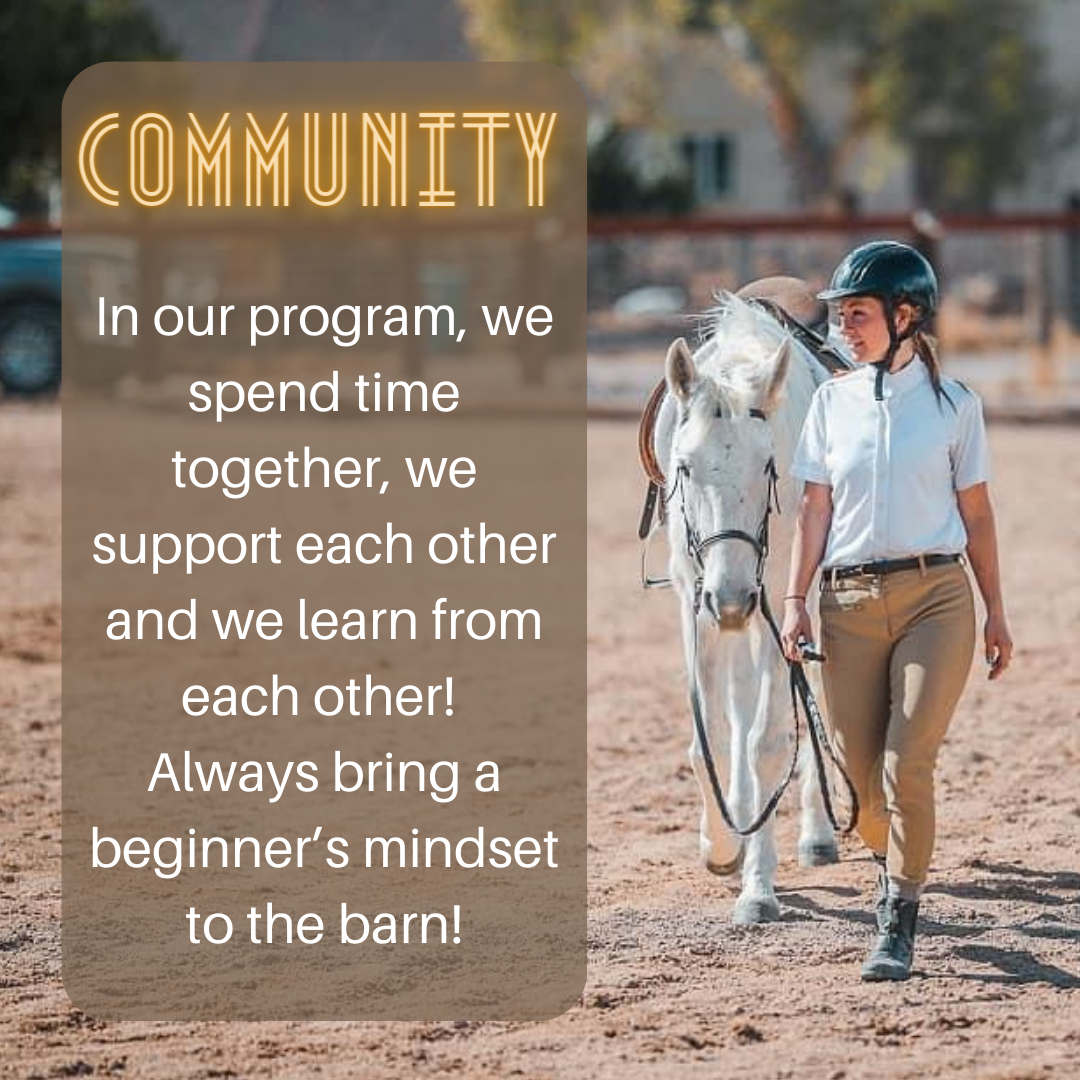 Even though you may feel new or inexperienced and not feel like you fit in, when you come to the barn, you are family! At the barn for my lessons, everyone is respectful and kind, treating others the way they'd like to be treated. There is a negative stigma attached to the horse world, and I strive to change that with consideration and patience! Everyone starts somewhere, and everyone in my program appreciates where each other is at! Community is what makes a barn family, a barn family!