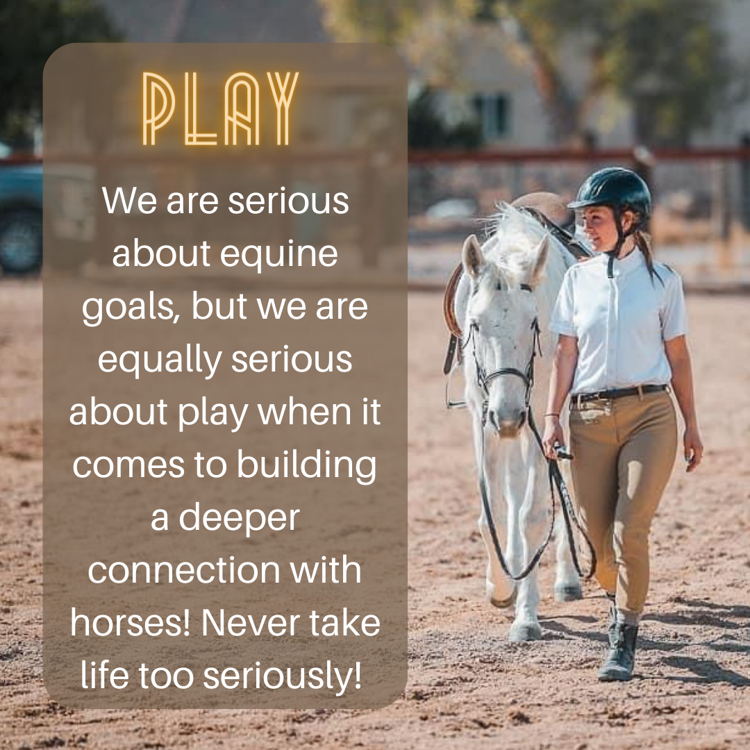 Never take life too seriously! When you're at the barn, my main goal for you is to have fun! If you're not smiling and enjoying your time connecting with the horses, nothing else about your ride will matter much. I have spent many days in the past being frustrated with my horse, ruining my mood and heading home feeling more stressed than when I arrived. That is NOT how horse interactions are supposed to leave you feeling. Most people have stories of their childhood horseback riding instructors yelling at them to put their heels down or their shoulders back, but not many people remember great memories about their riding lessons. I am focused on becoming the change I want to see in this industry, and that starts with making play a priority in each and every lesson. Staying relaxed and gaining little wins is important to the big picture.