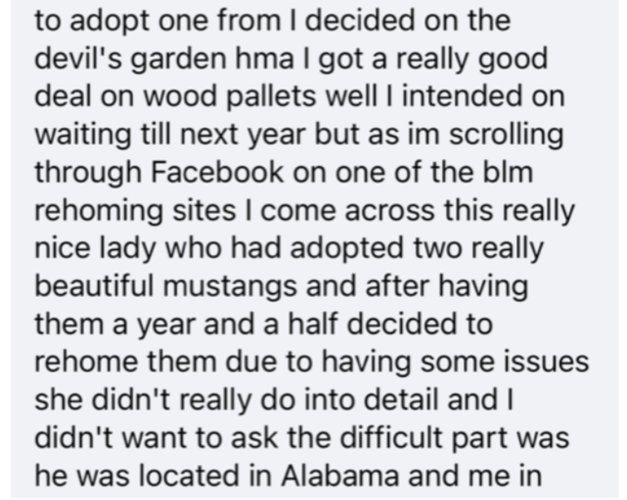 How Jake Got Into Mustangs: So to try to make a long story short, my older sister was the one into horses when I was a kid. She had to muck out stalls to pay for lessons. I chose basketball--less to clean up, but I loved going out and sitting on her TB while watching her work. I always loved the mountains and the wild, and always thought if I ever get a horse I want a wild mustang....Fast forward to 2015 as 33 year old I finally was in a placed to "get into horses." I took 6 months of riding lessons 2 days a week, and then went to the Kiger Auction in Oregon. I wanted a wild mustang from my boyish dreams. I wanted to be a part of the process from wild, to first touch, to being my partner. I love to hunt and fish, and wanted a horse that would naturally be comfortable, and probably more so than me out in the back woods. I wanted a mustang as I heard they were sure footed, hearty, and good bones and hooves, but mostly because I wanted the process of having that partnership from start to finish.