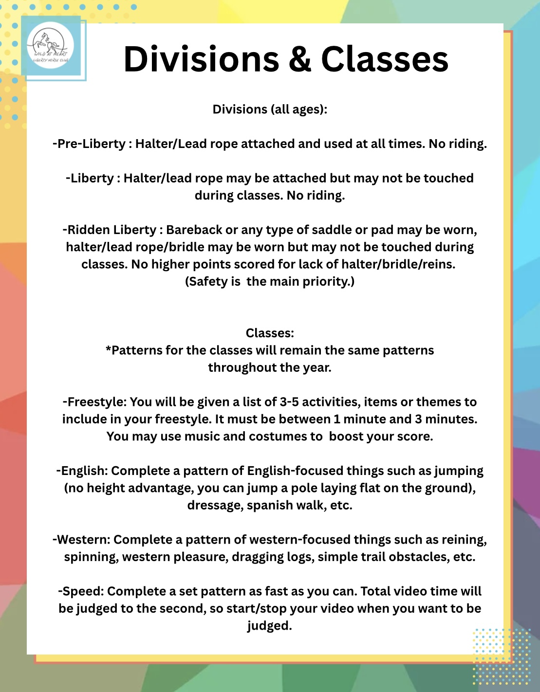 -Liberty : Halter/lead rope may be attached but may not be touched during classes. No riding.